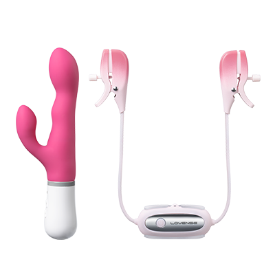 Dual-stim rabbit vibrator paired with vibrating nipple clamps for three-zone stimulation.
